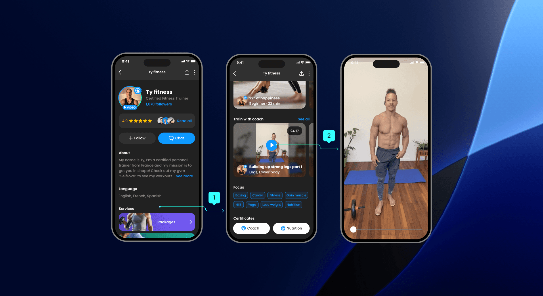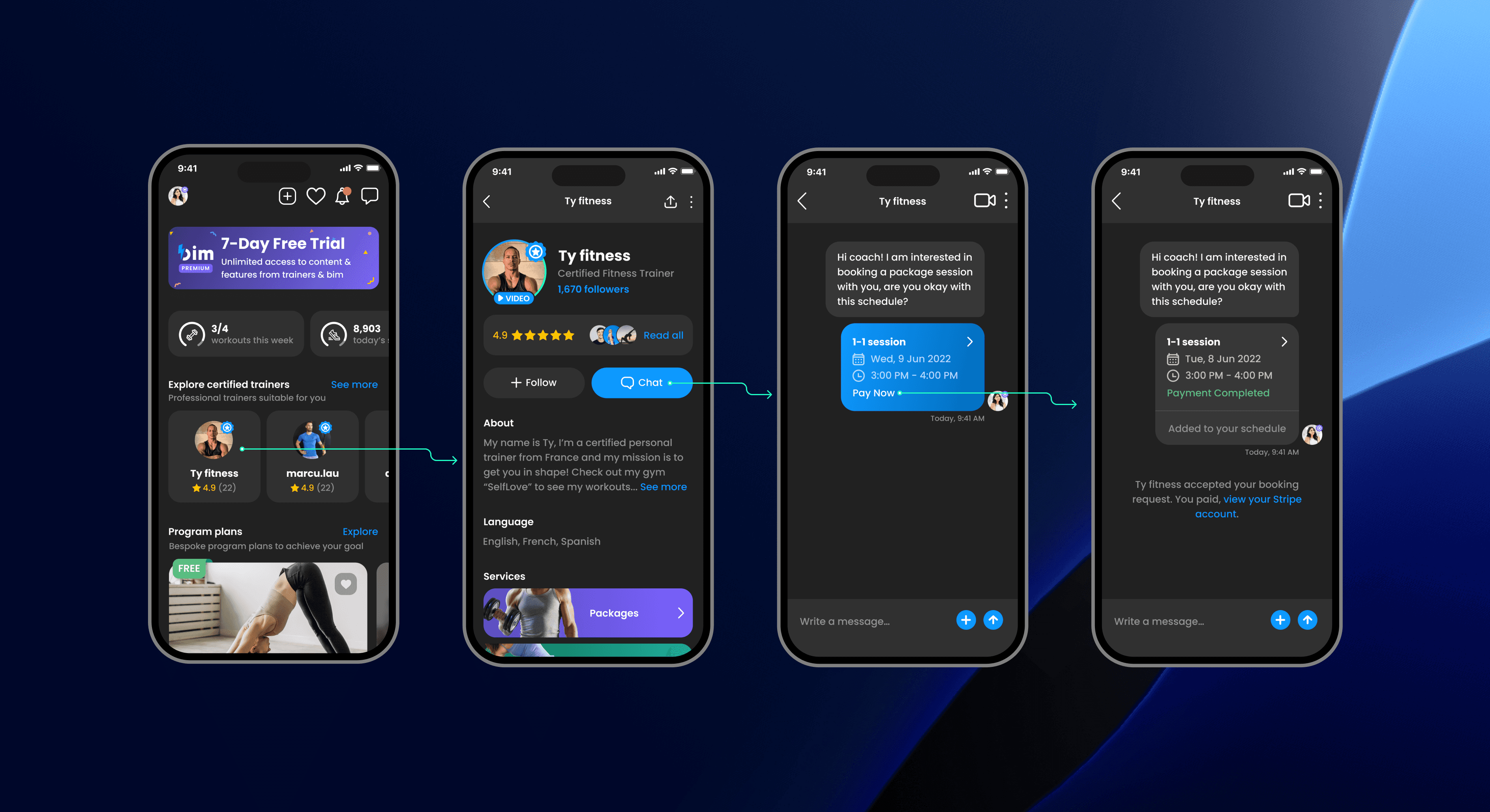 Create a mobile application that facilitates virtual one-on-one training sessions between trainees and preferred personal trainers.