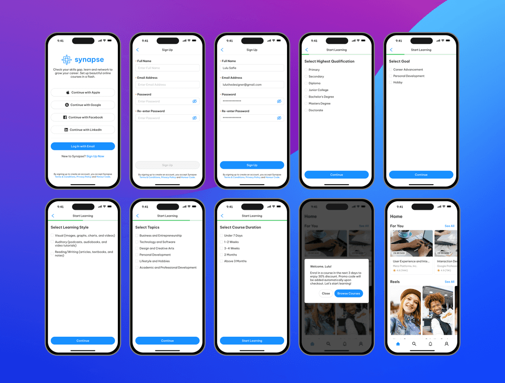 • Actions: Discovers Synapse through search, social media, or recommendations. Explores course offerings and reviews.